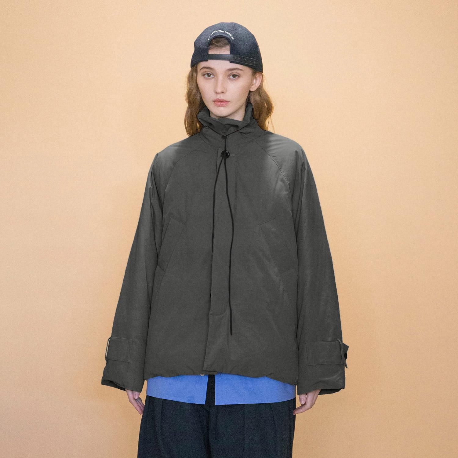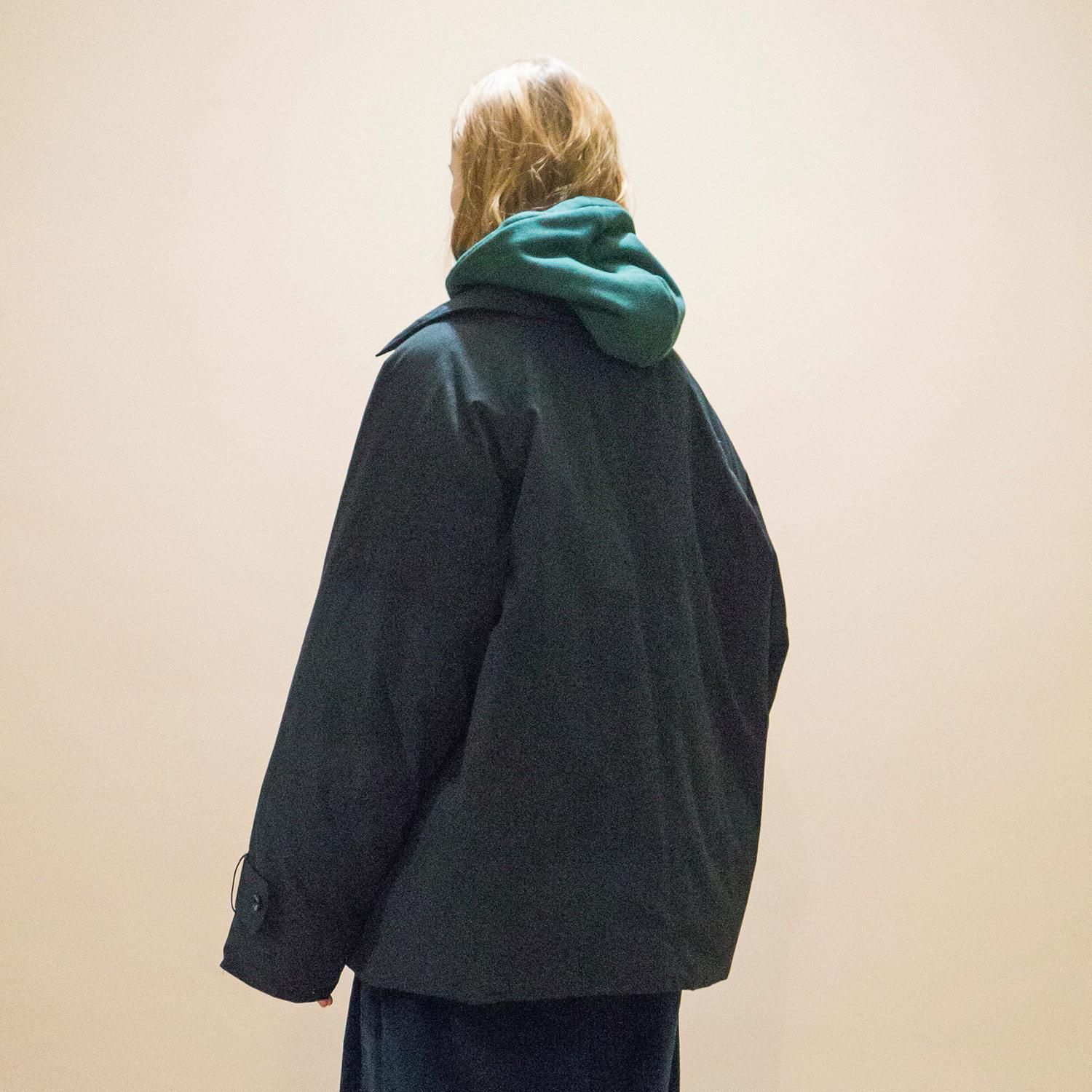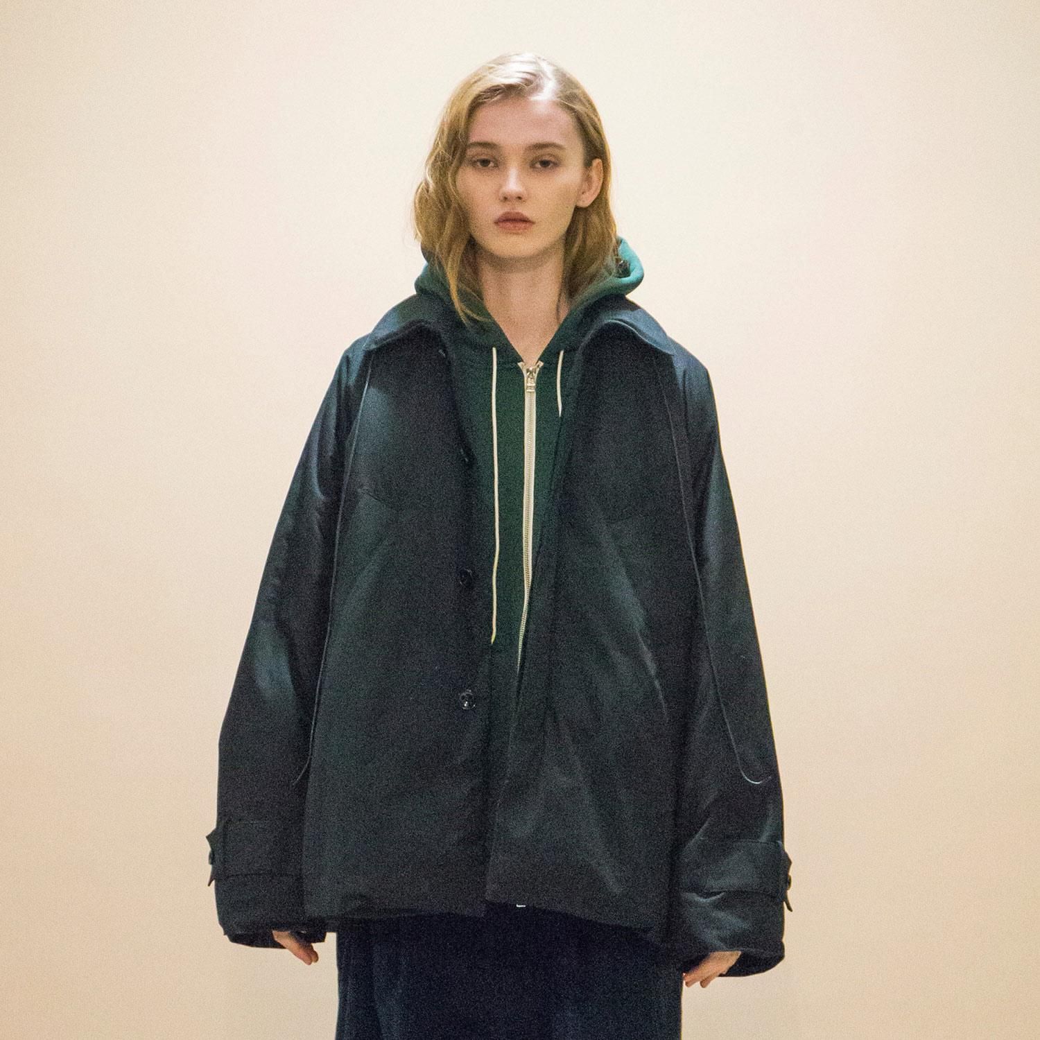 ロングコートの丈を半分に切った様な緩やかな Aラインシルエットが特徴。ラグランスリーブで