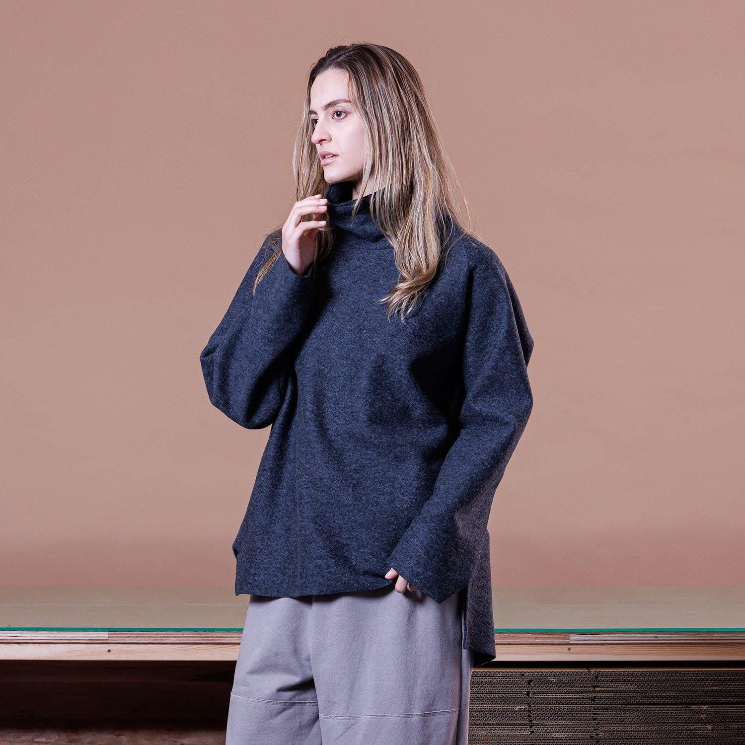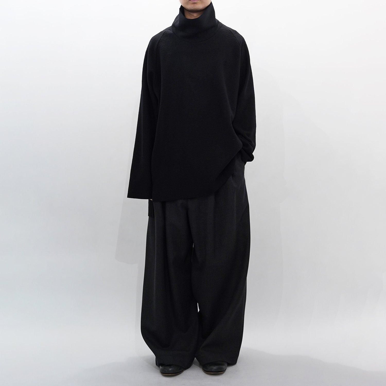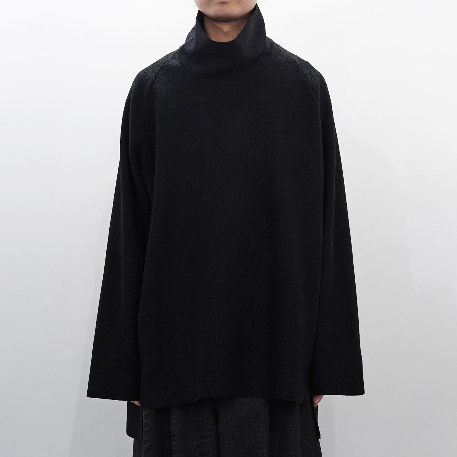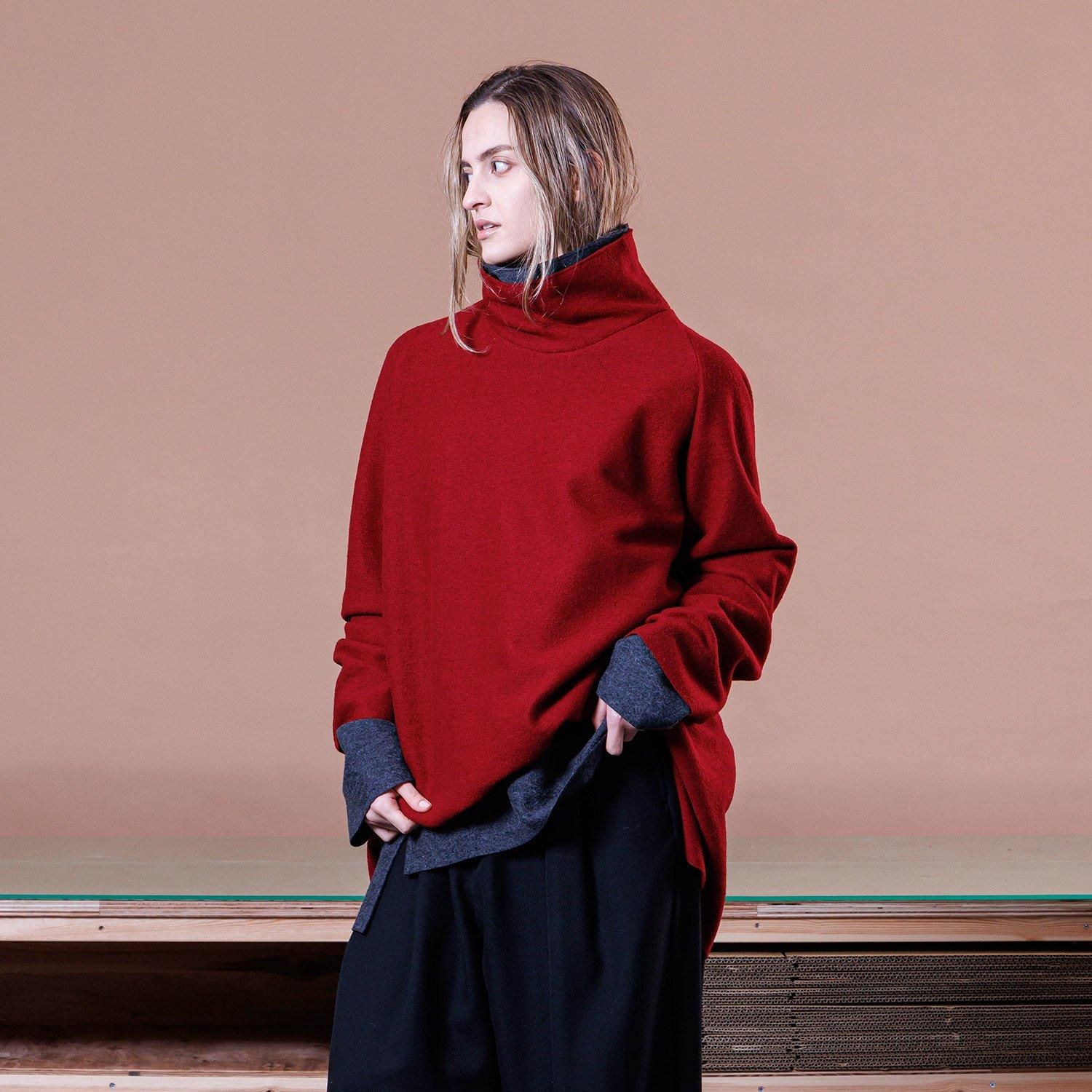 ボリュームのある少し緩めのハイネックデザインと、ラグランスリーブで全体的に