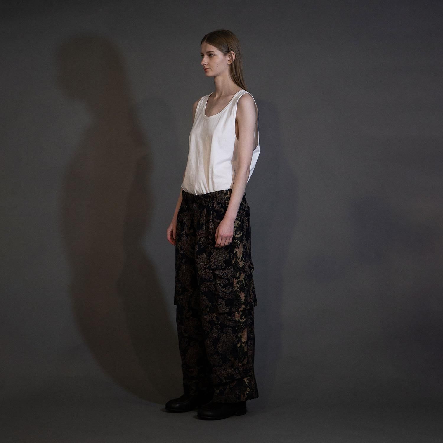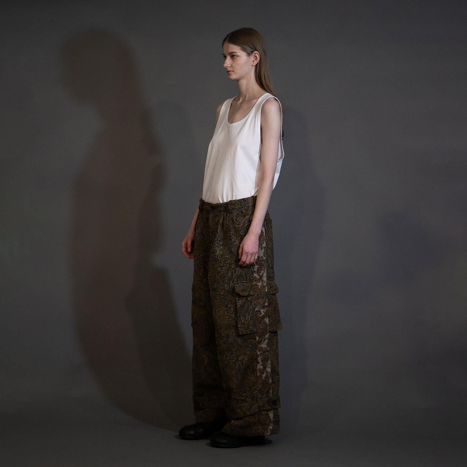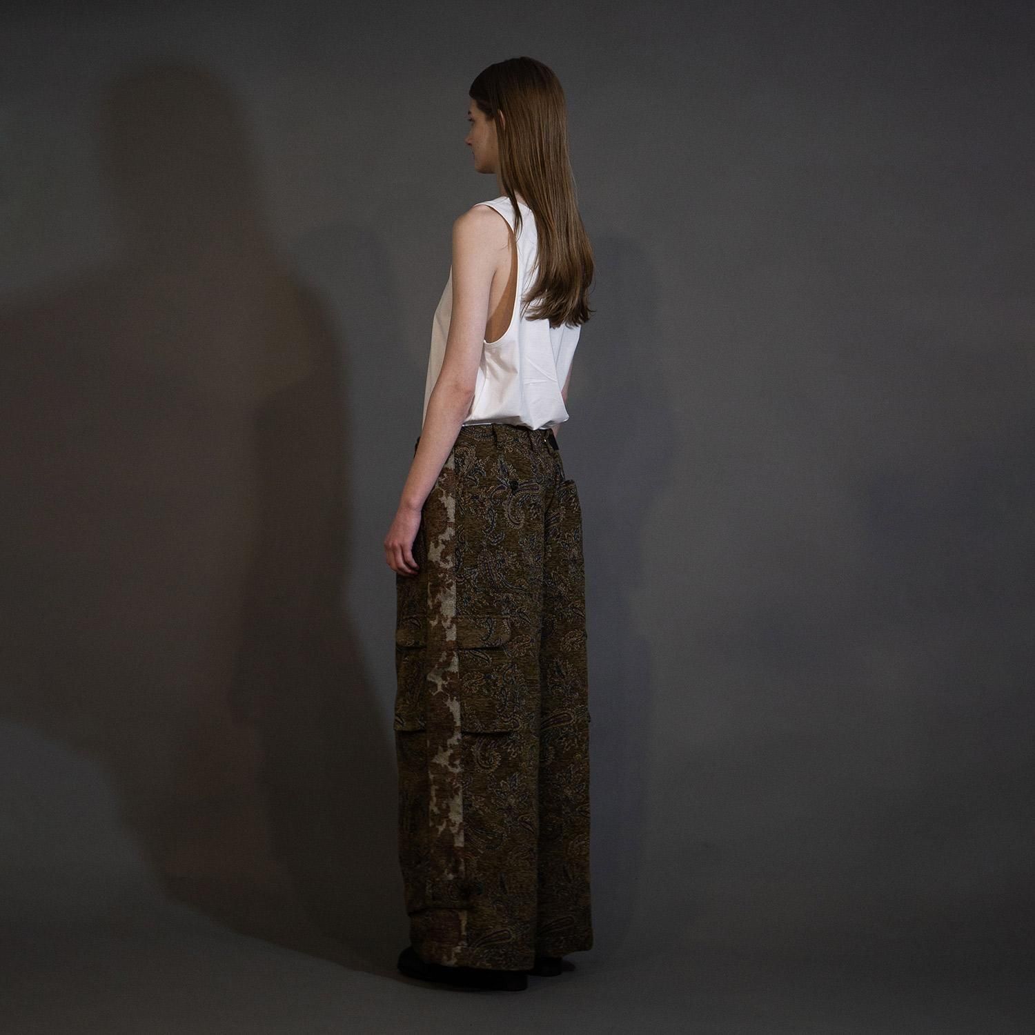 こちらのカーゴパンツは、同じくシェニールヤーンジャガードを反転して裏使いにし、両サイドで