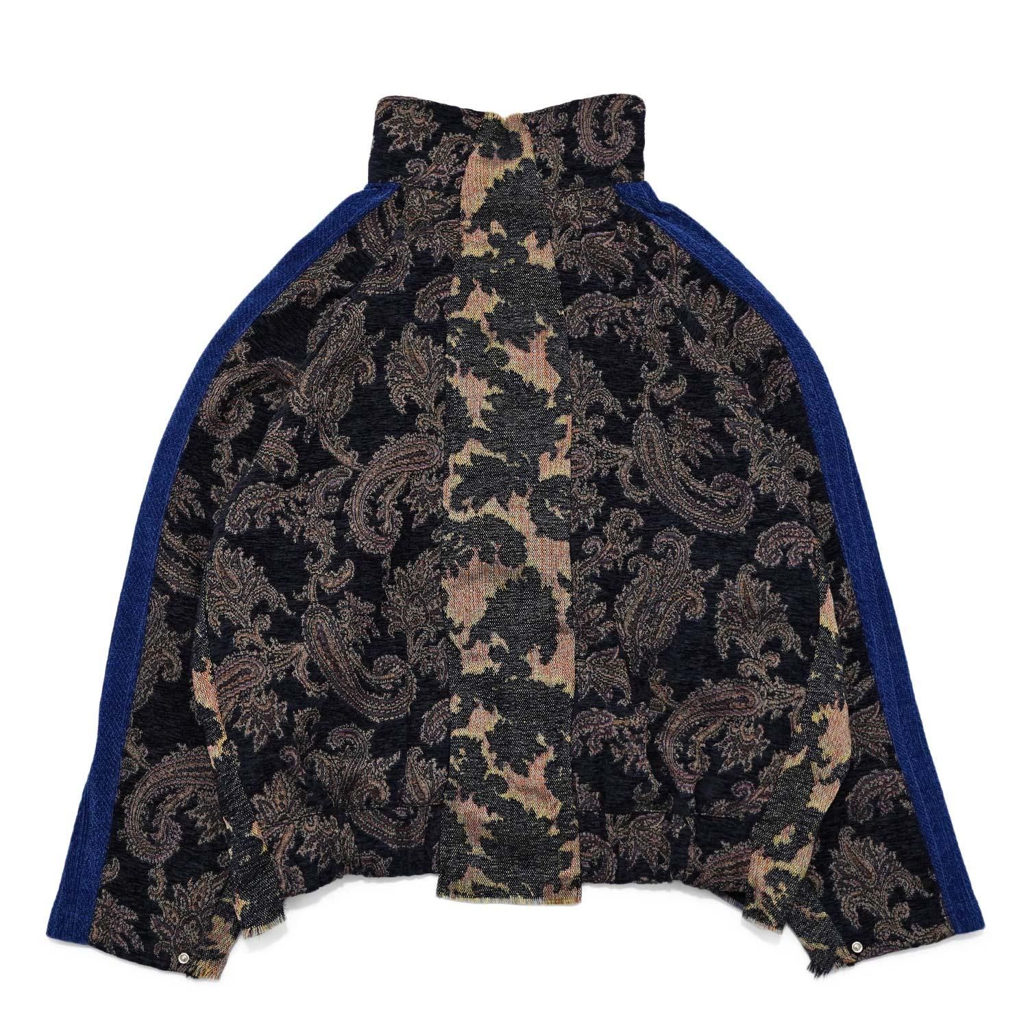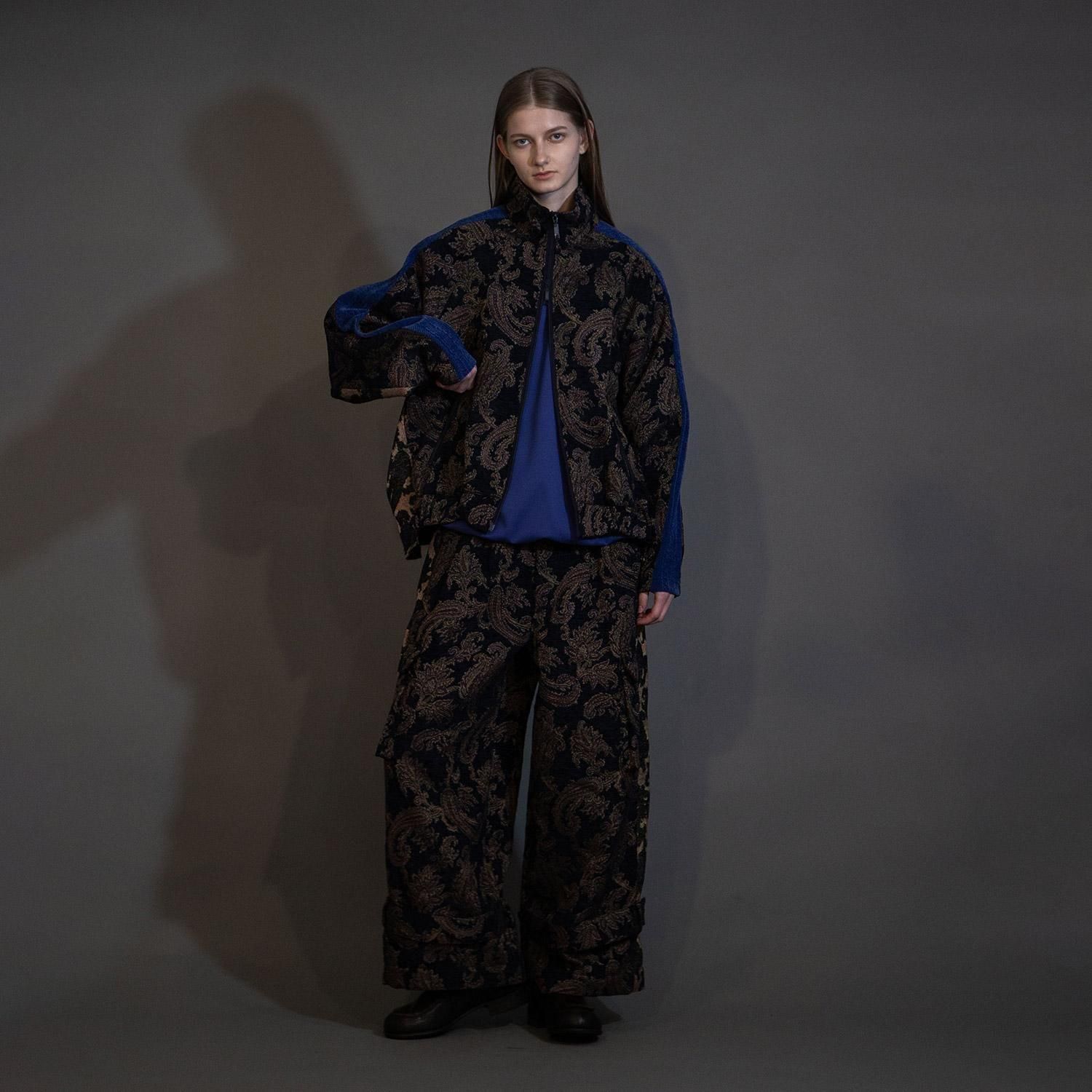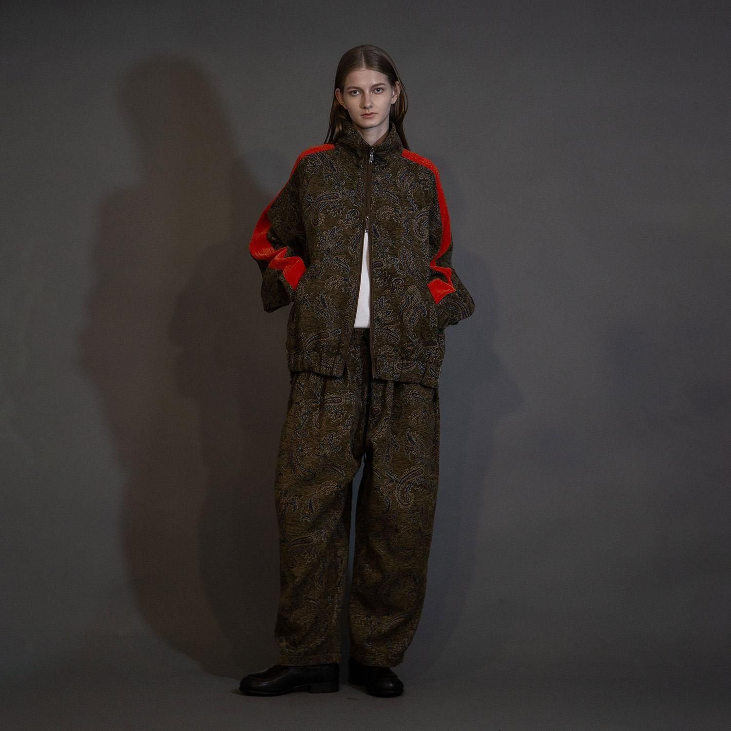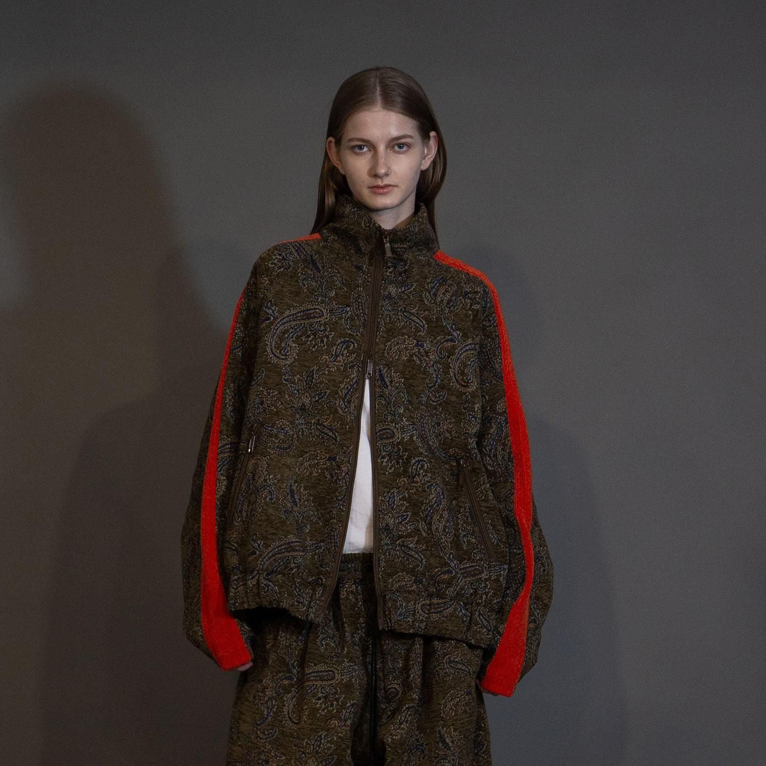 トラックジャケットには、ゴブランシェニール織を掛け合わせ、さらにジャガード生地を後身頃の中心と、