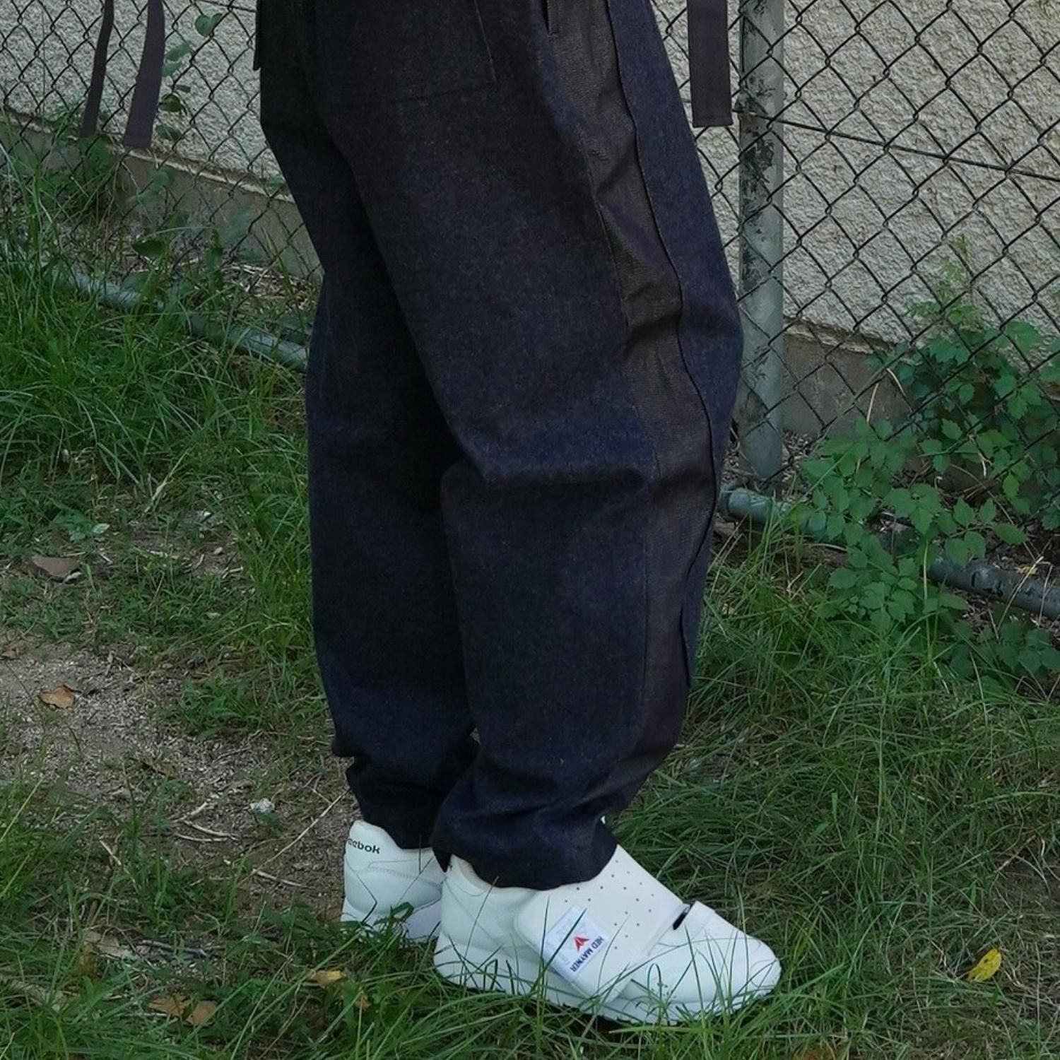 フロントの 2種類の素材を切り替える曲線が特徴的なパンツです。