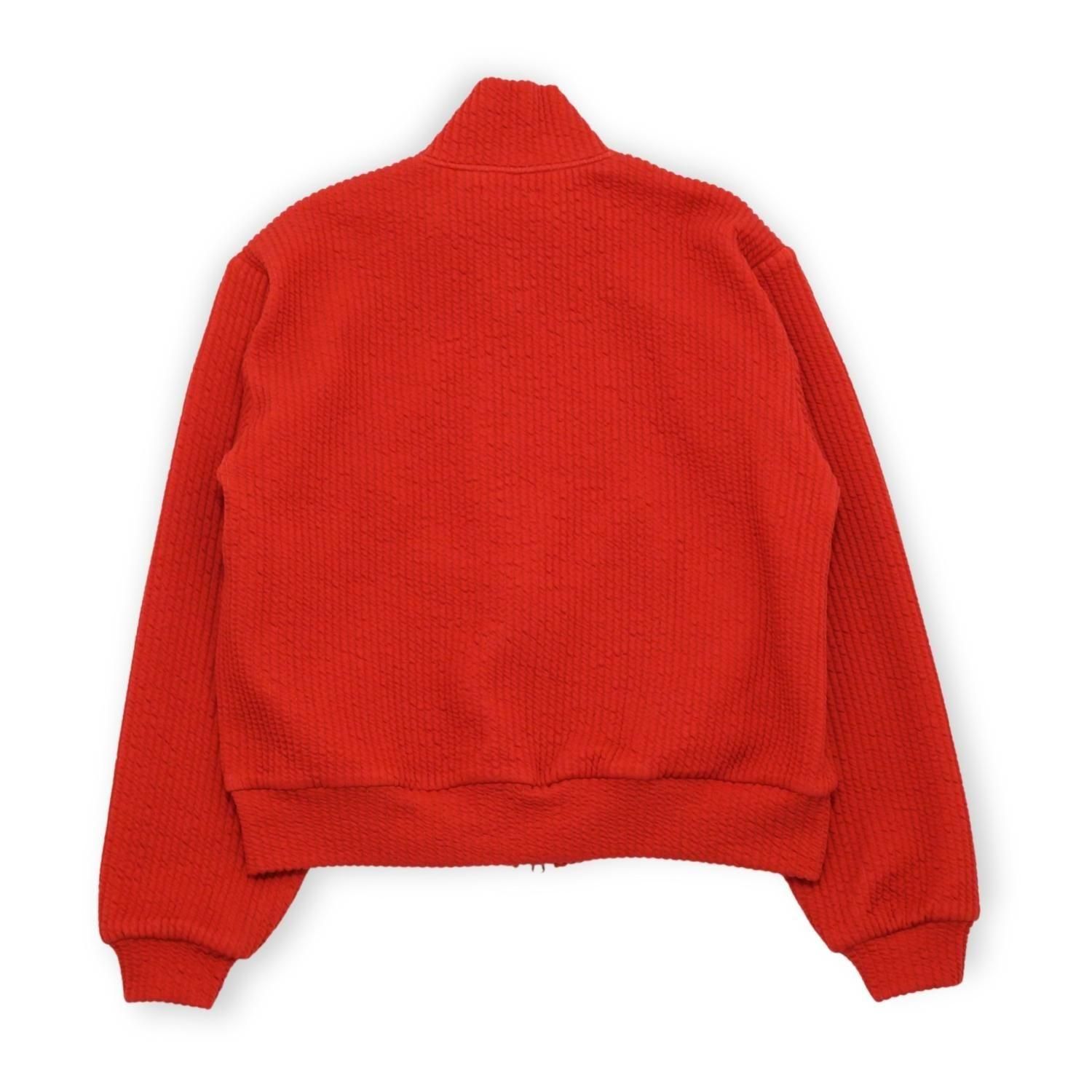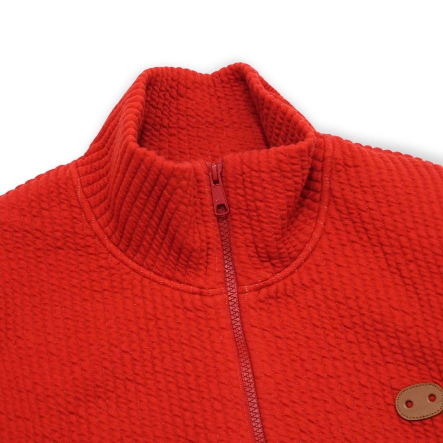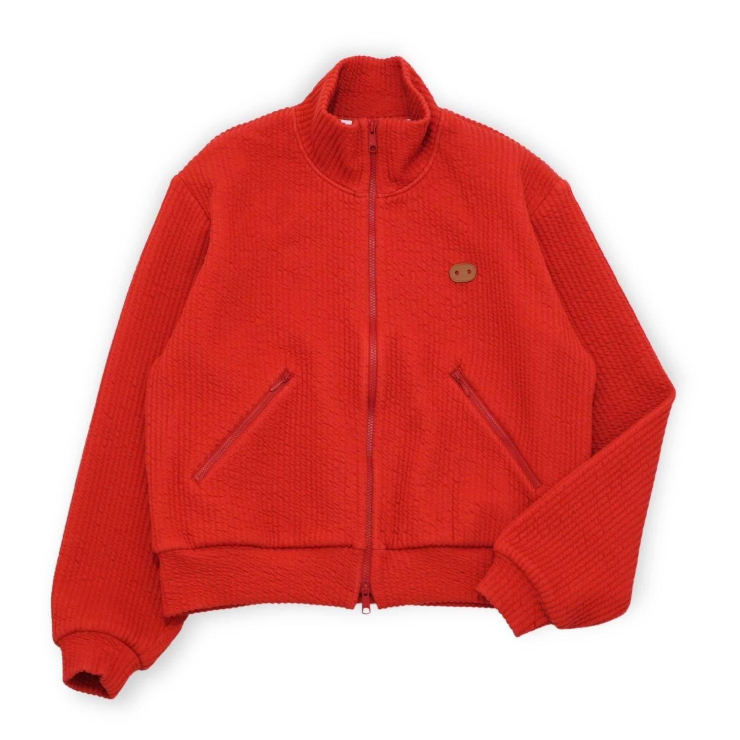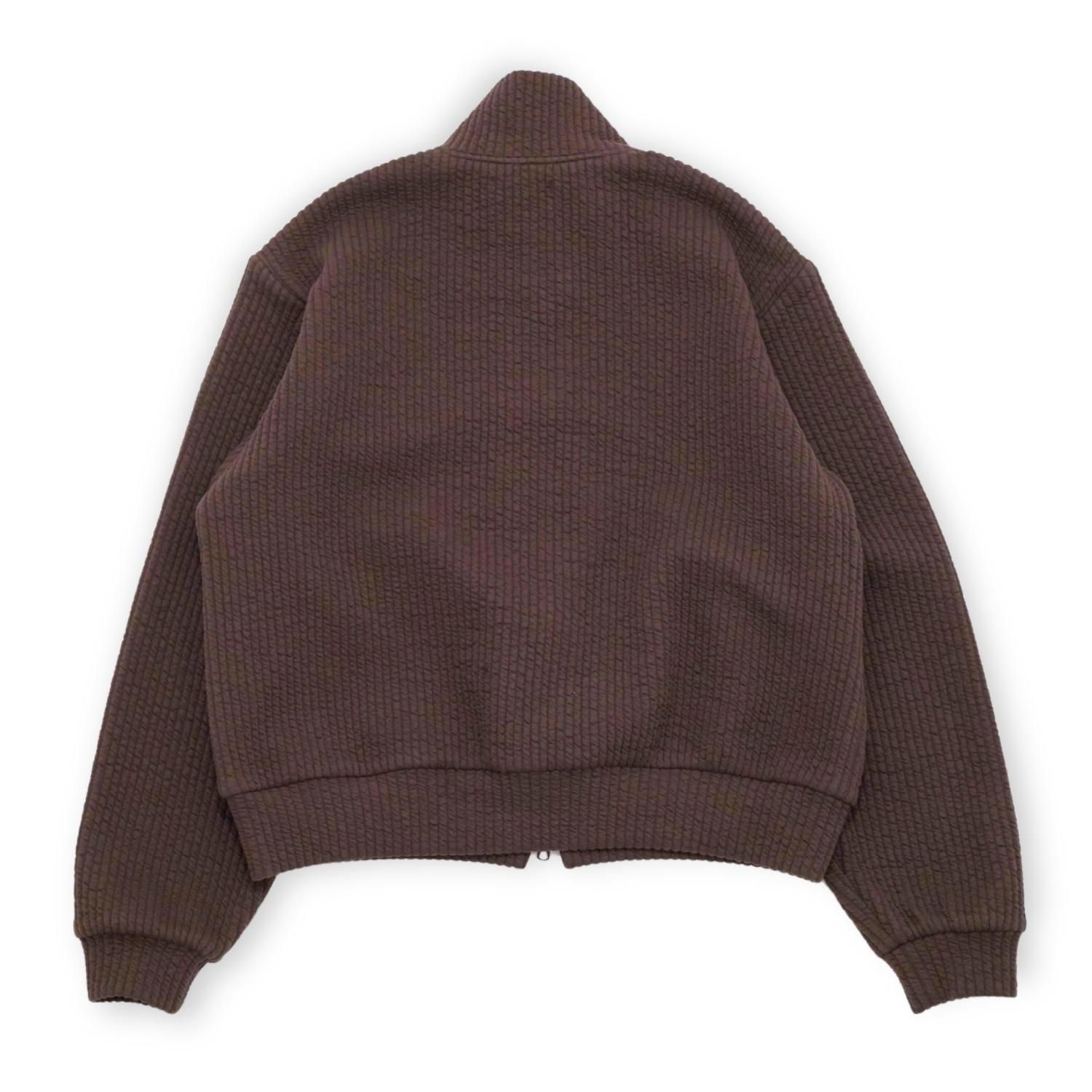 キルトのような立体感を持たせた、ジャガード編みのストライプ柄が印象的なスタンドカラージャケット。