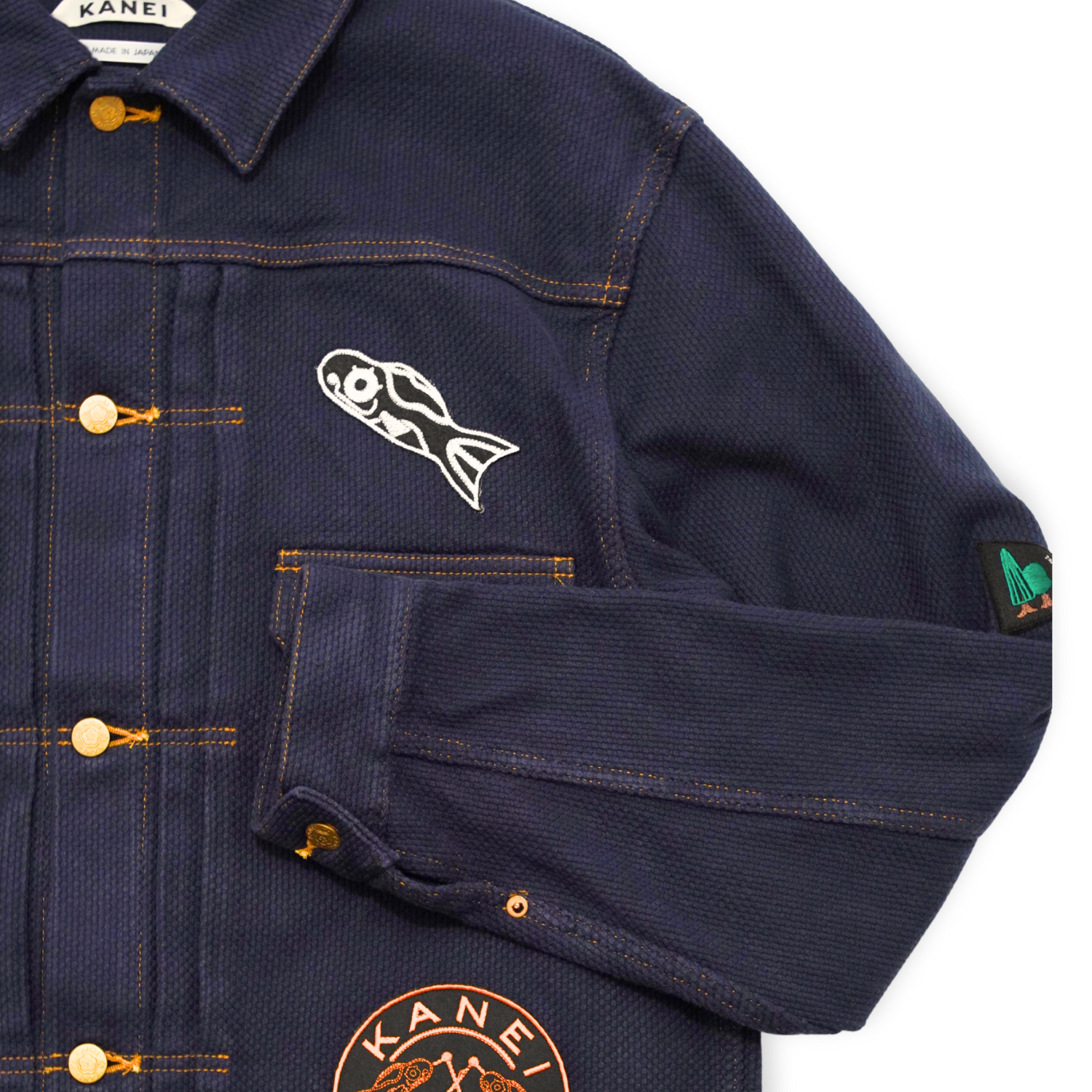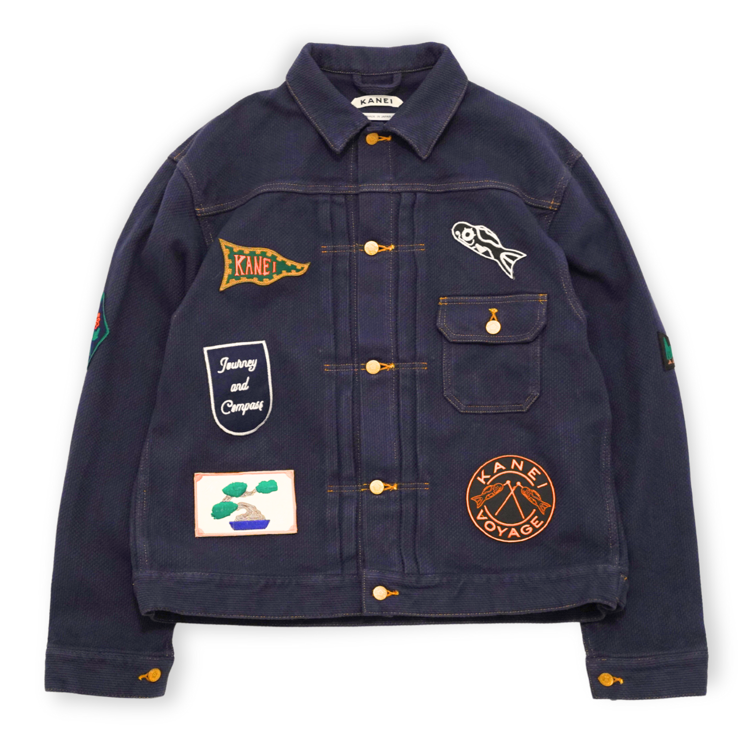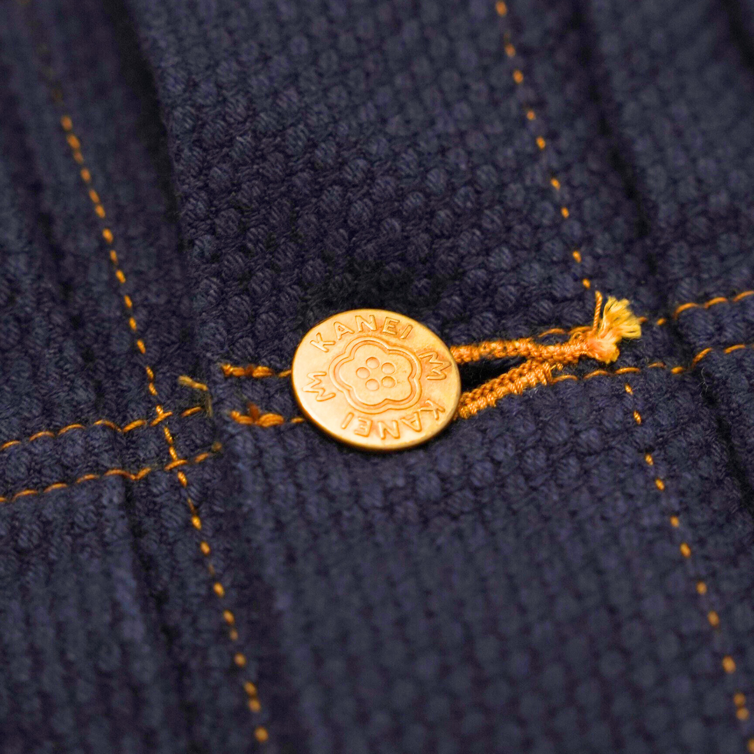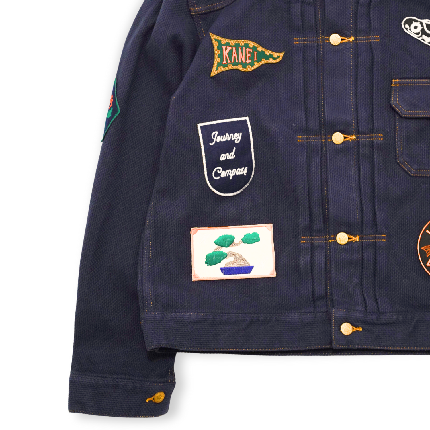 大戦モデルの仕様を踏襲した、深い紺色に染めた刺し子織トラッカージャケットに、