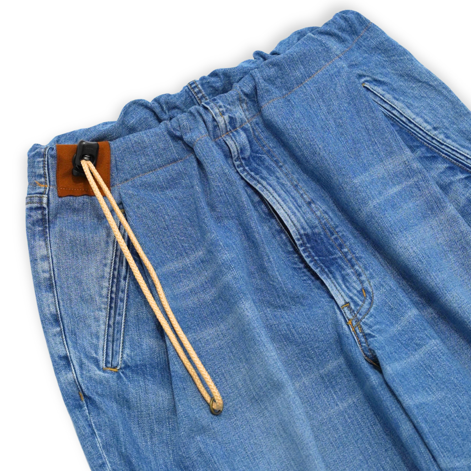 ウエスト仕様は、腰の片側の紐を引っ張ることで様々なサイズ調整が可能。