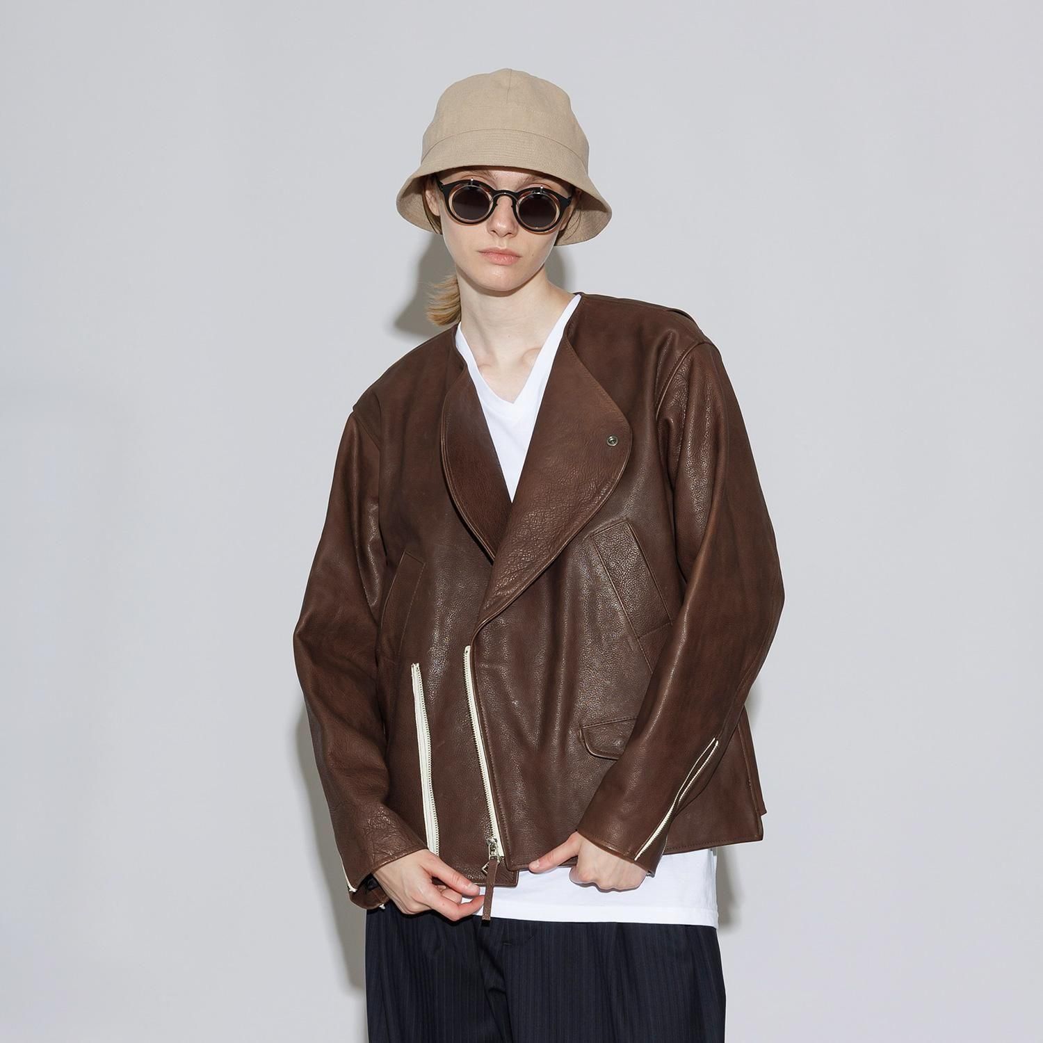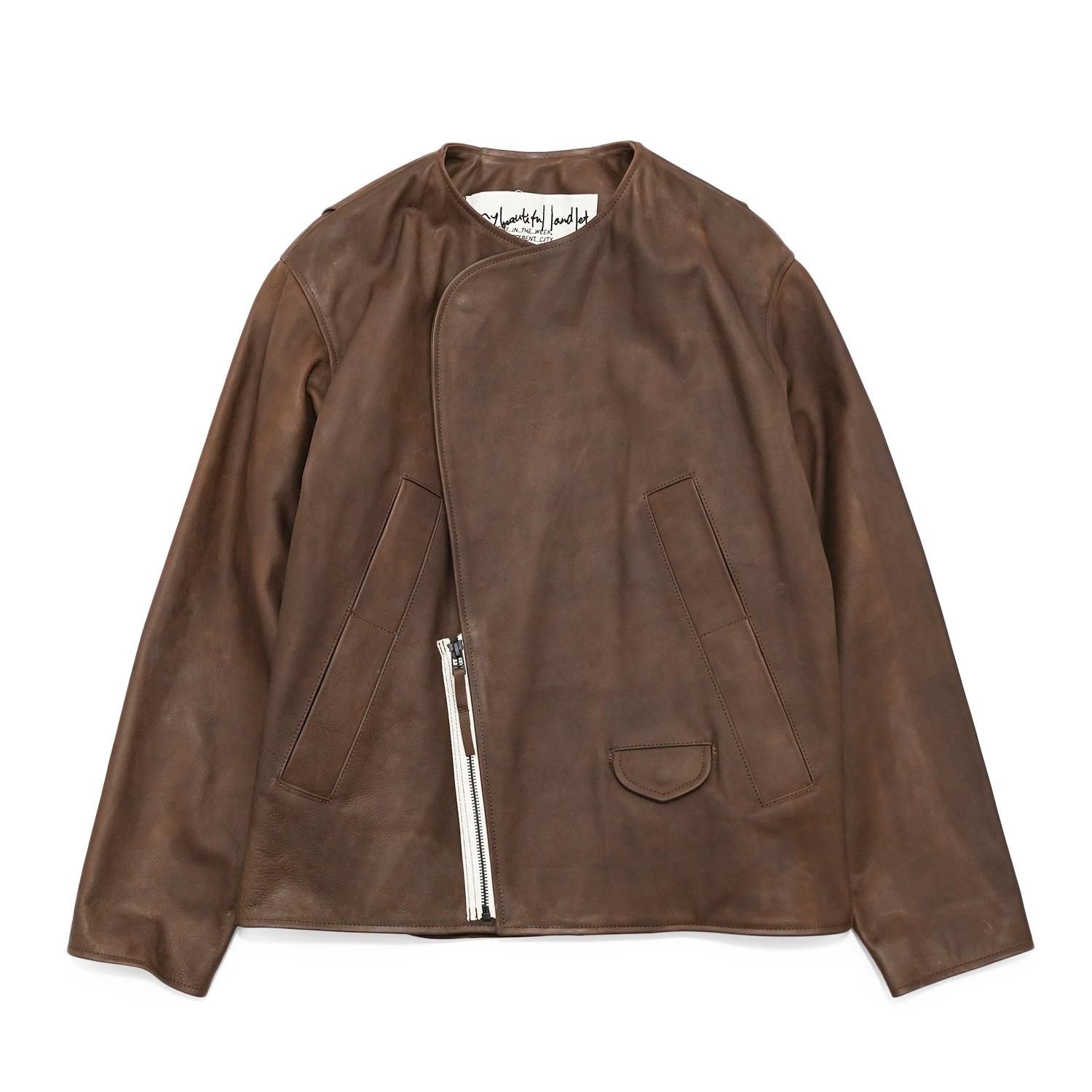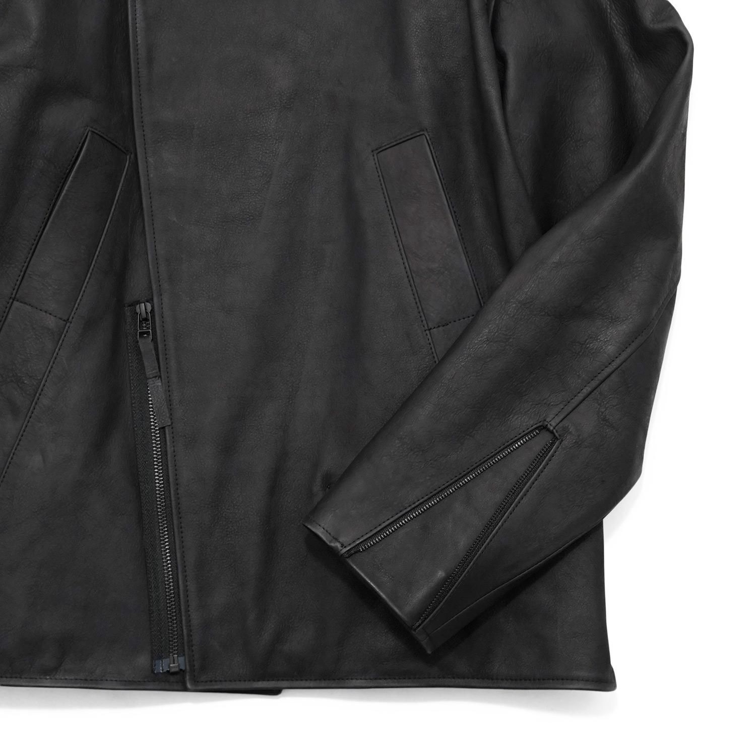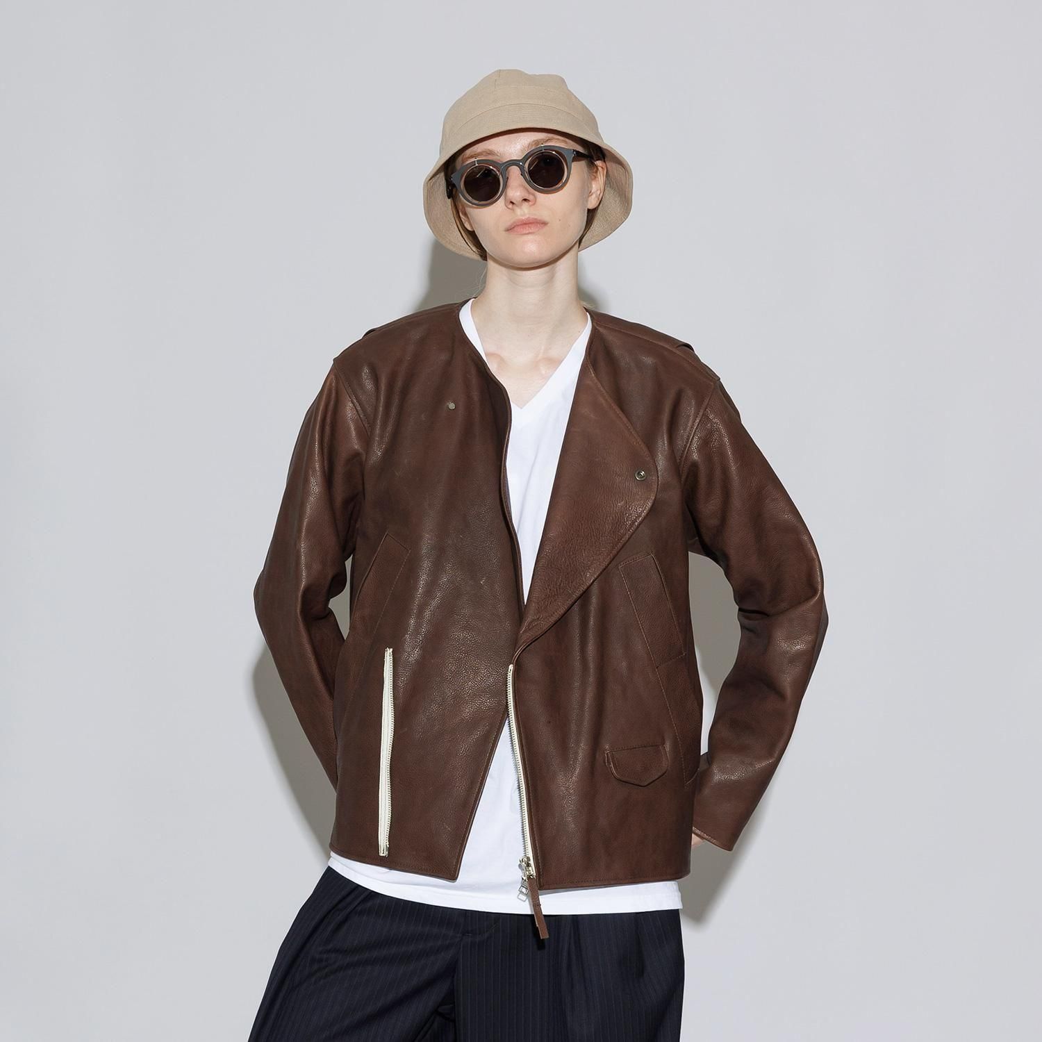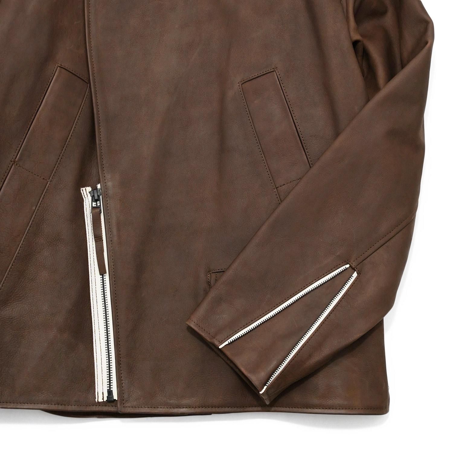 シボ感と厚みのあるハードでタフな牛革を使用したノーカラーライダースジャケット。