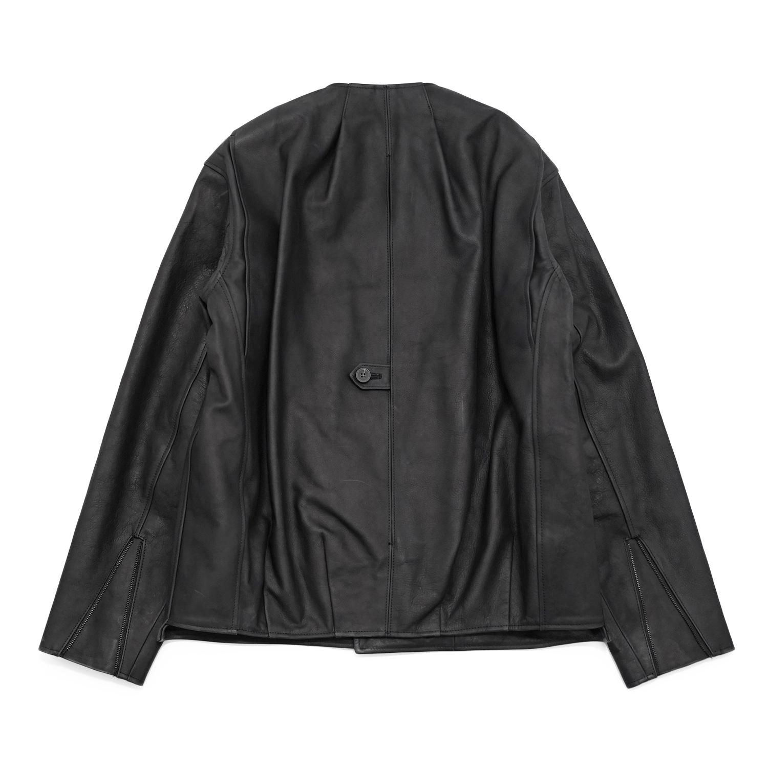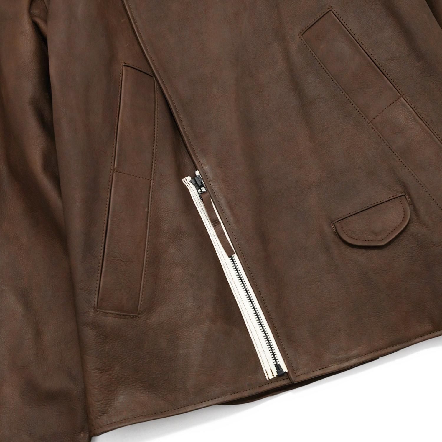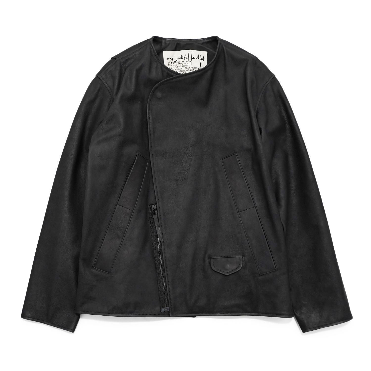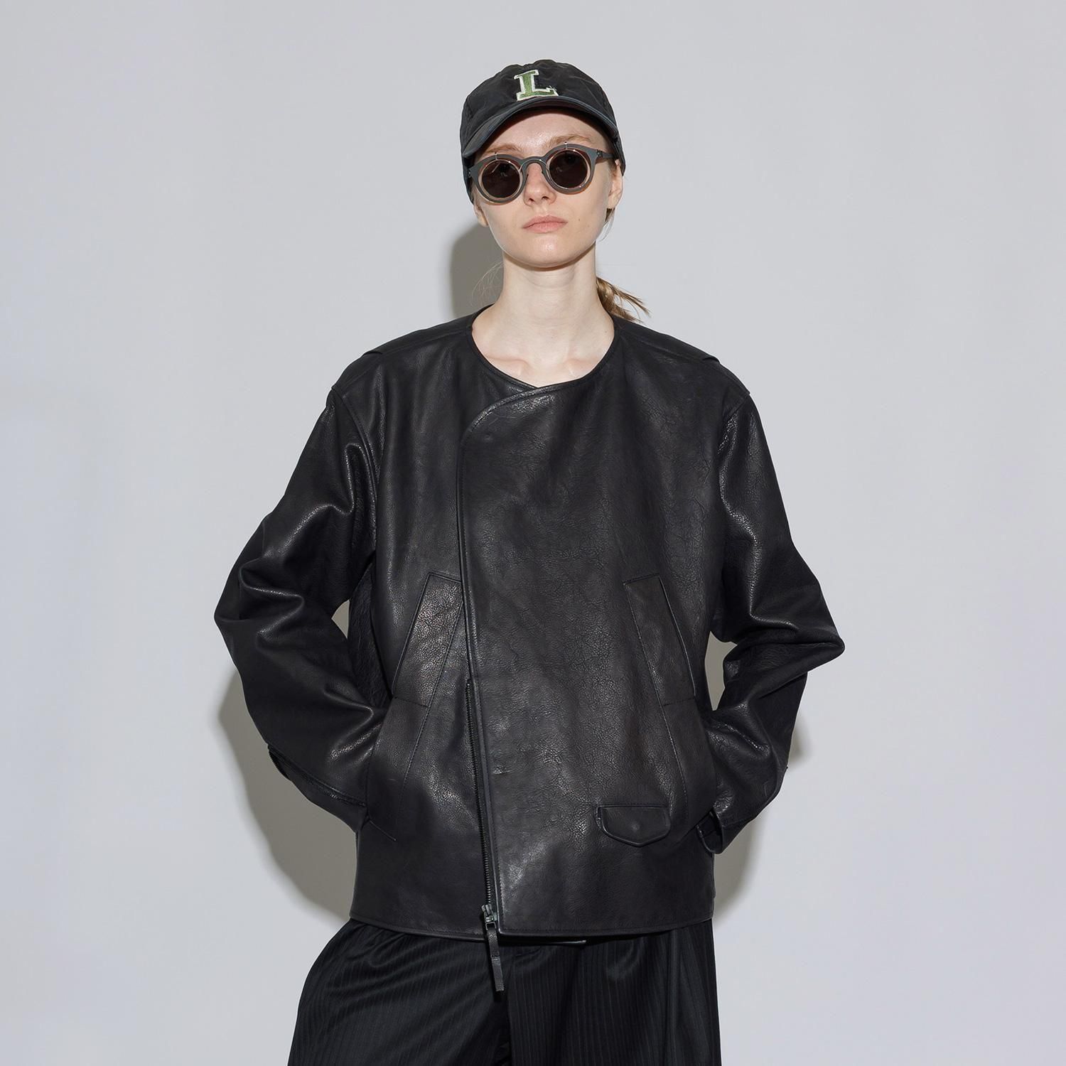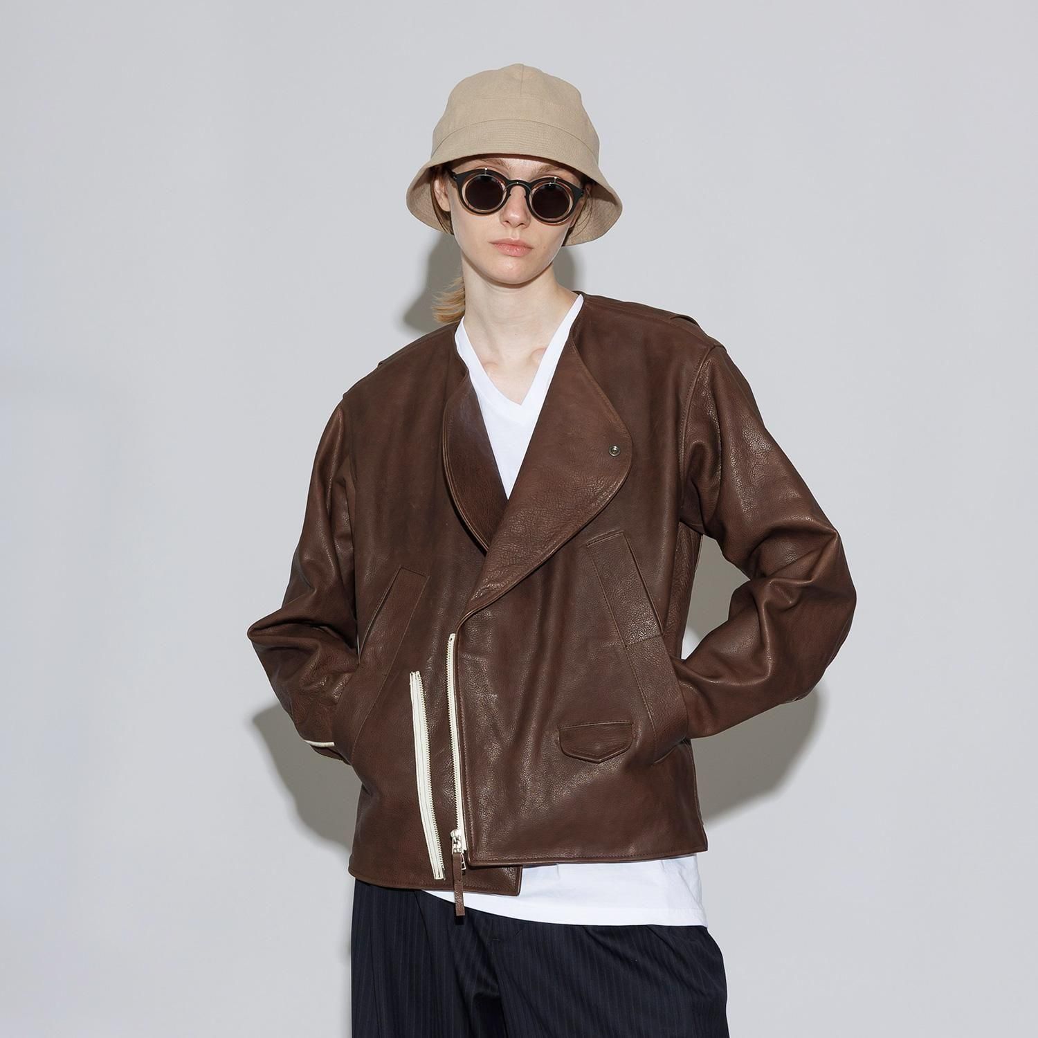 シボ感と厚みのあるハードでタフな牛革を使用したノーカラーライダースジャケット。