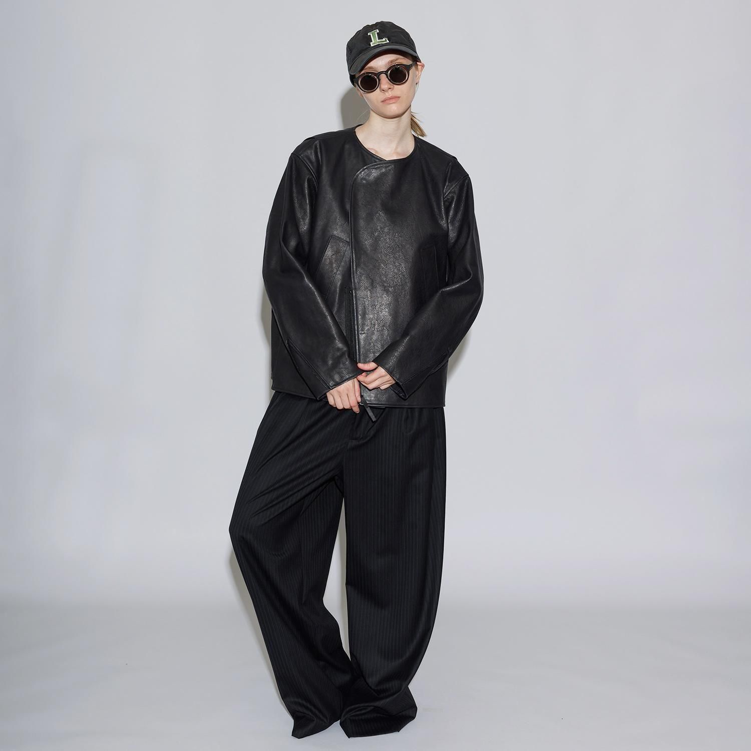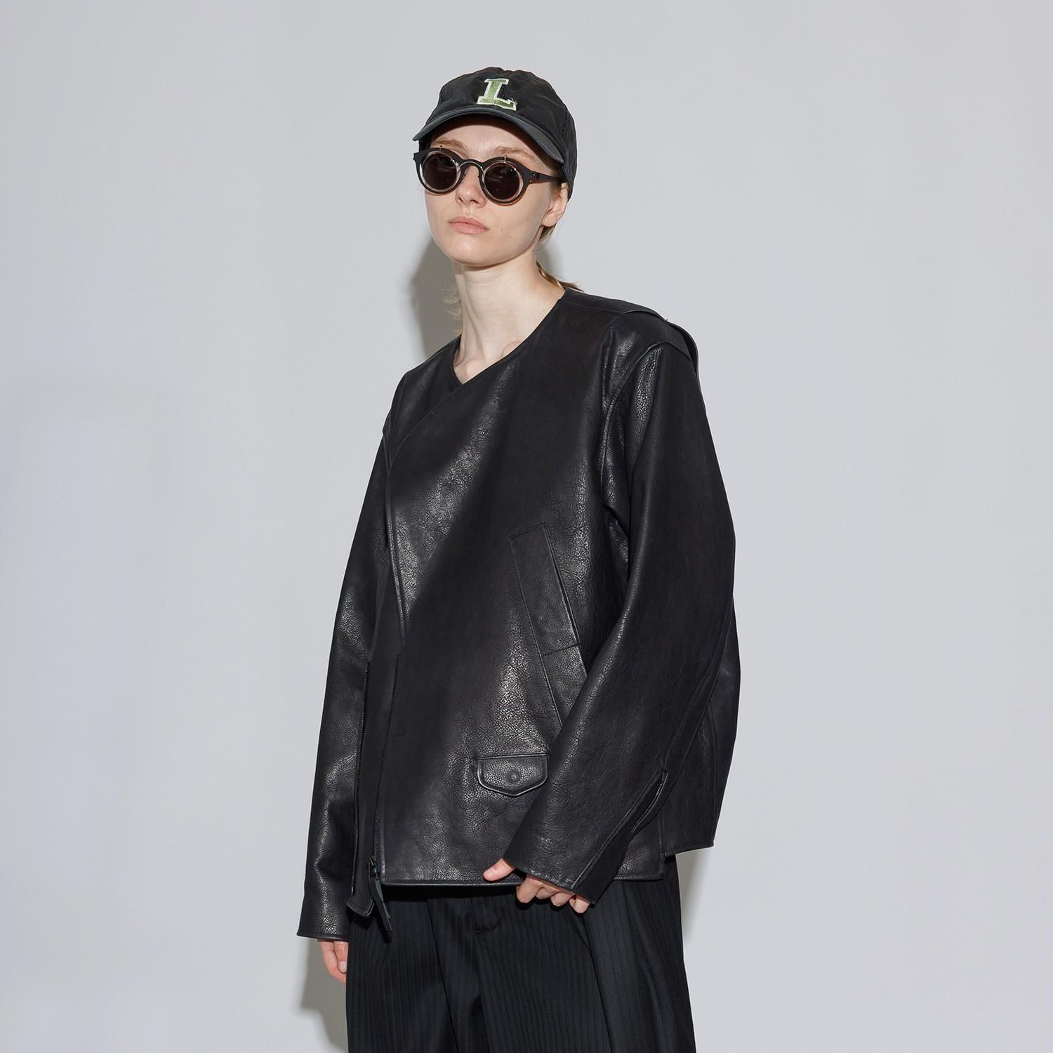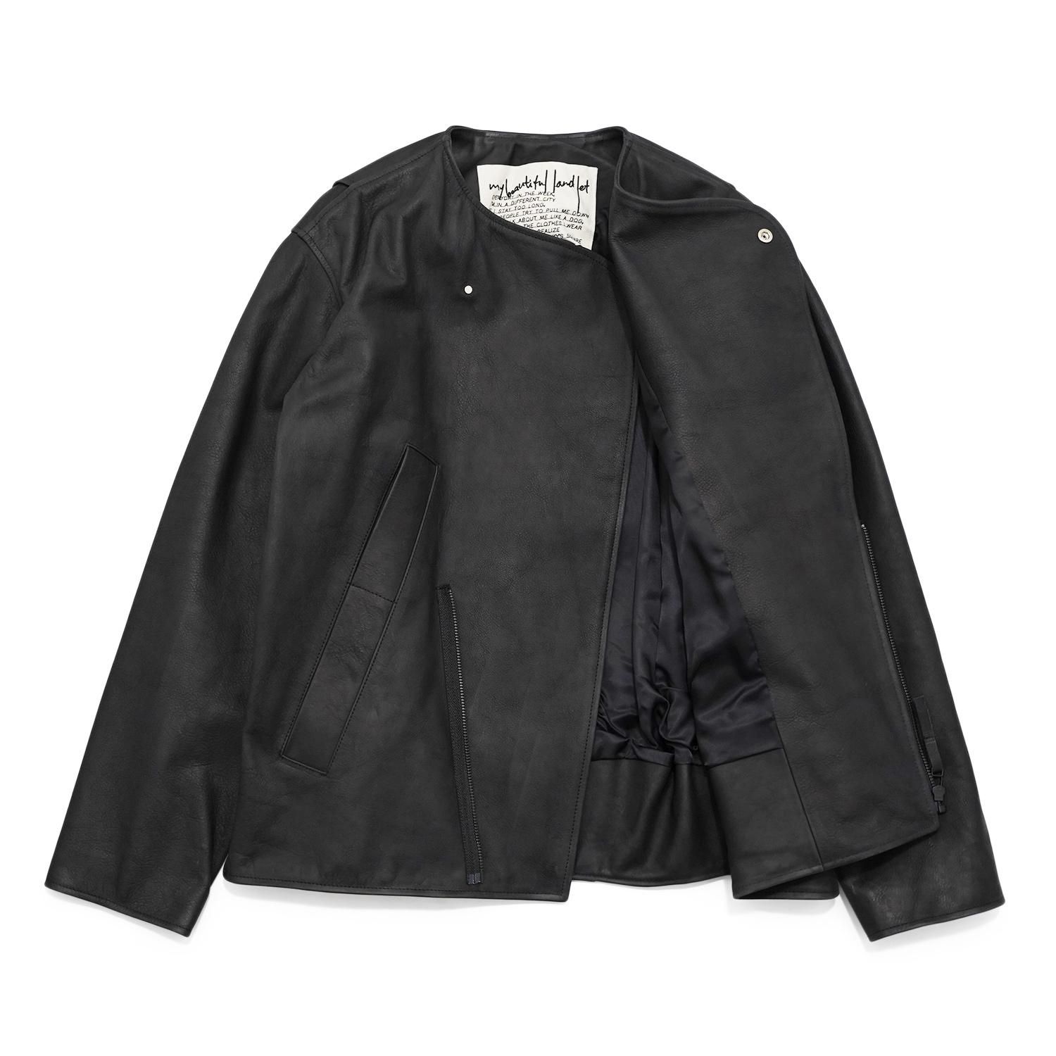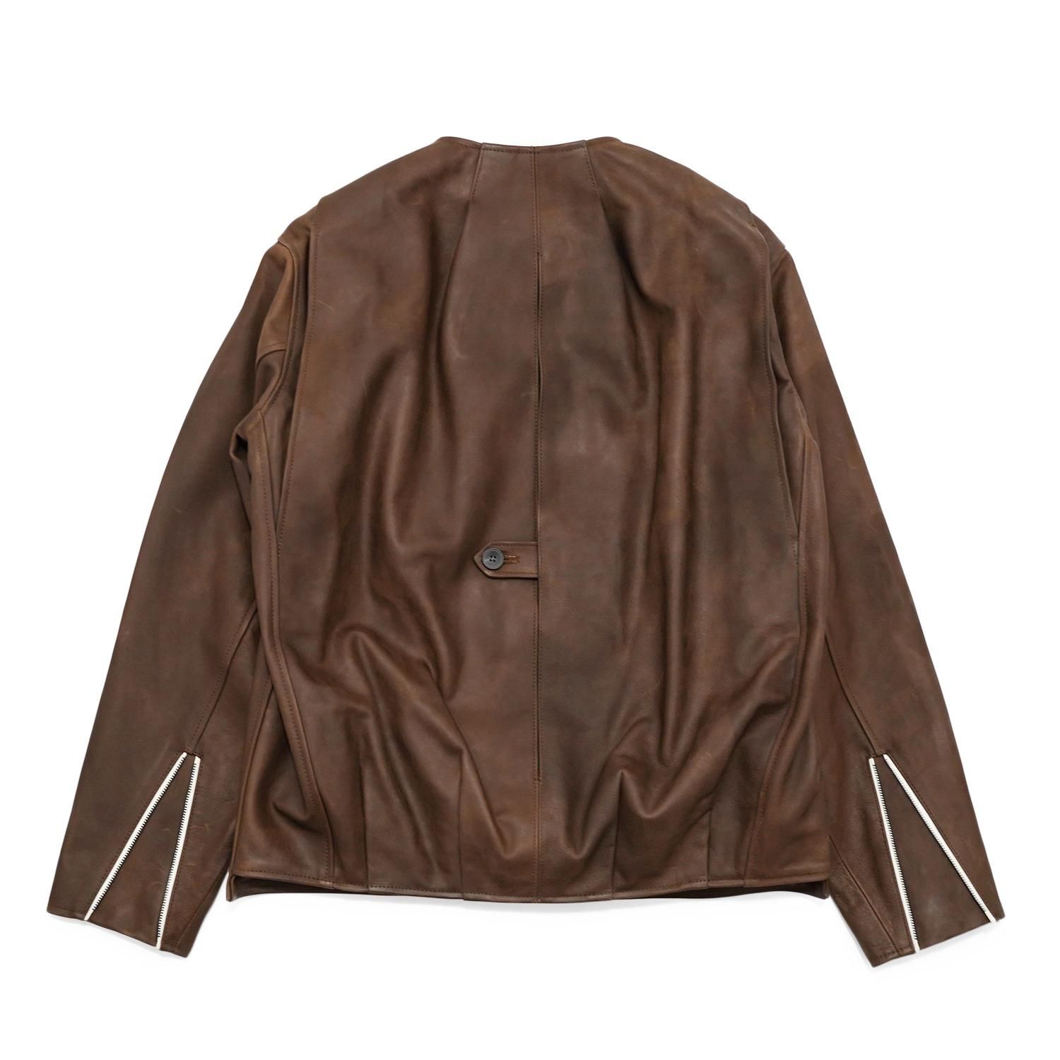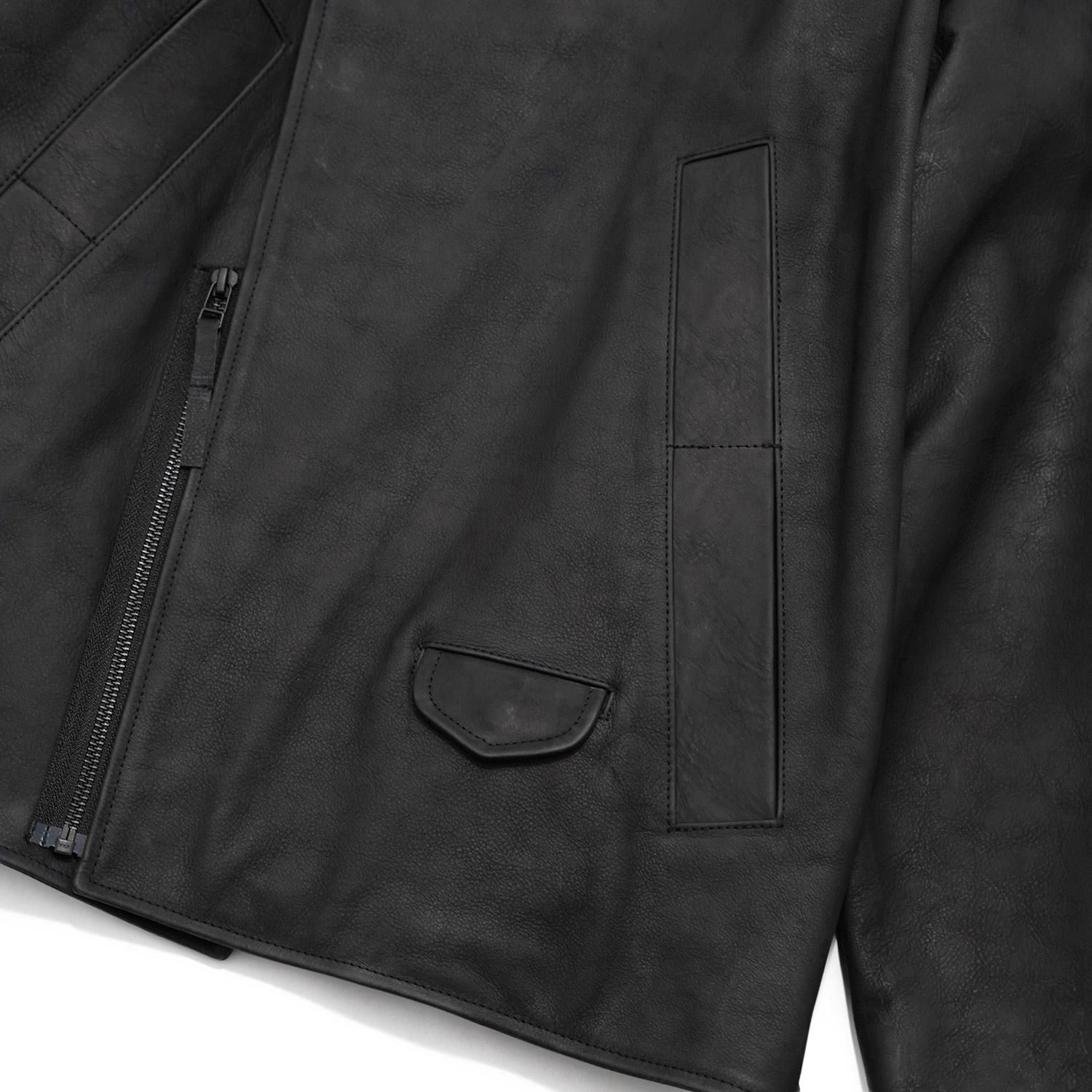 シボ感と厚みのあるハードでタフな牛革を使用したノーカラーライダースジャケット。