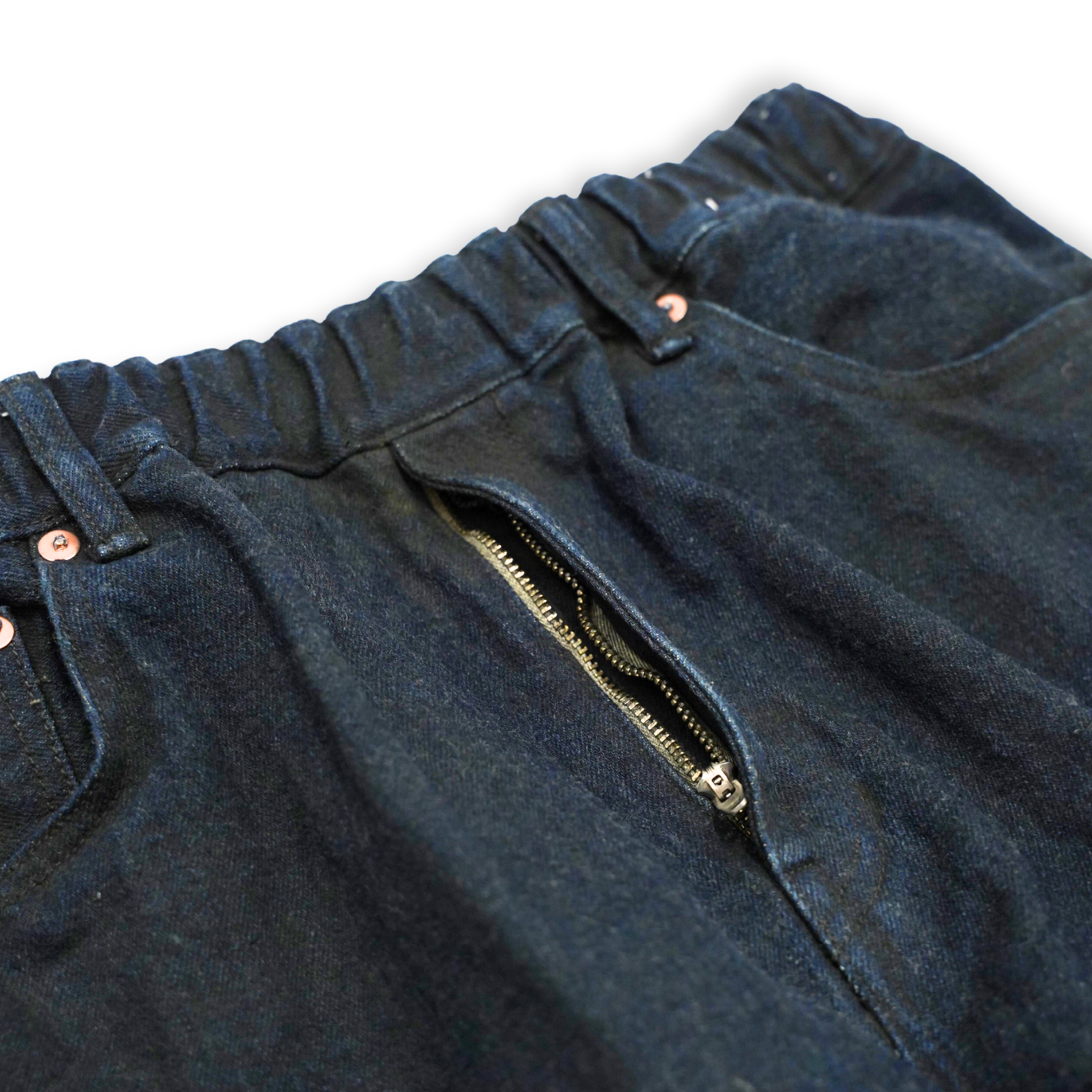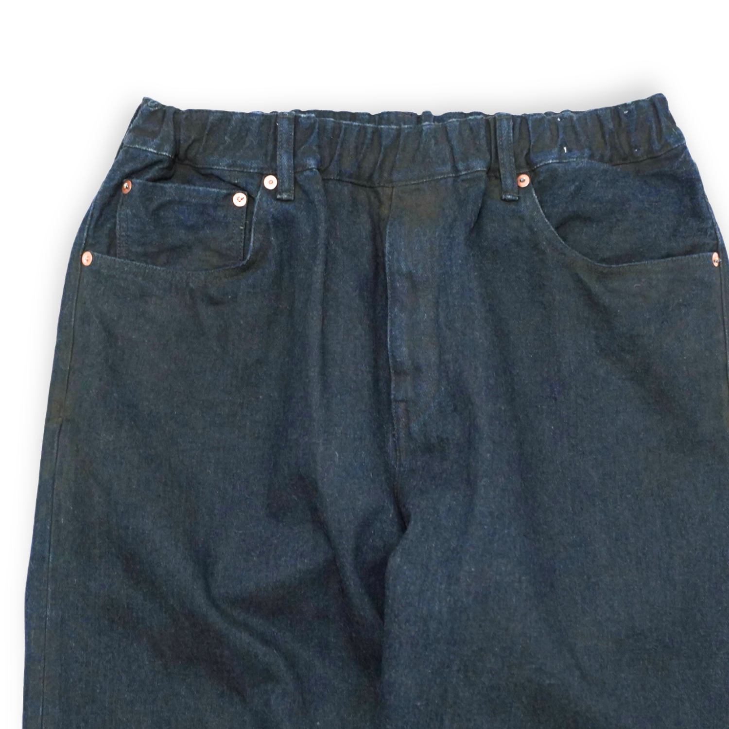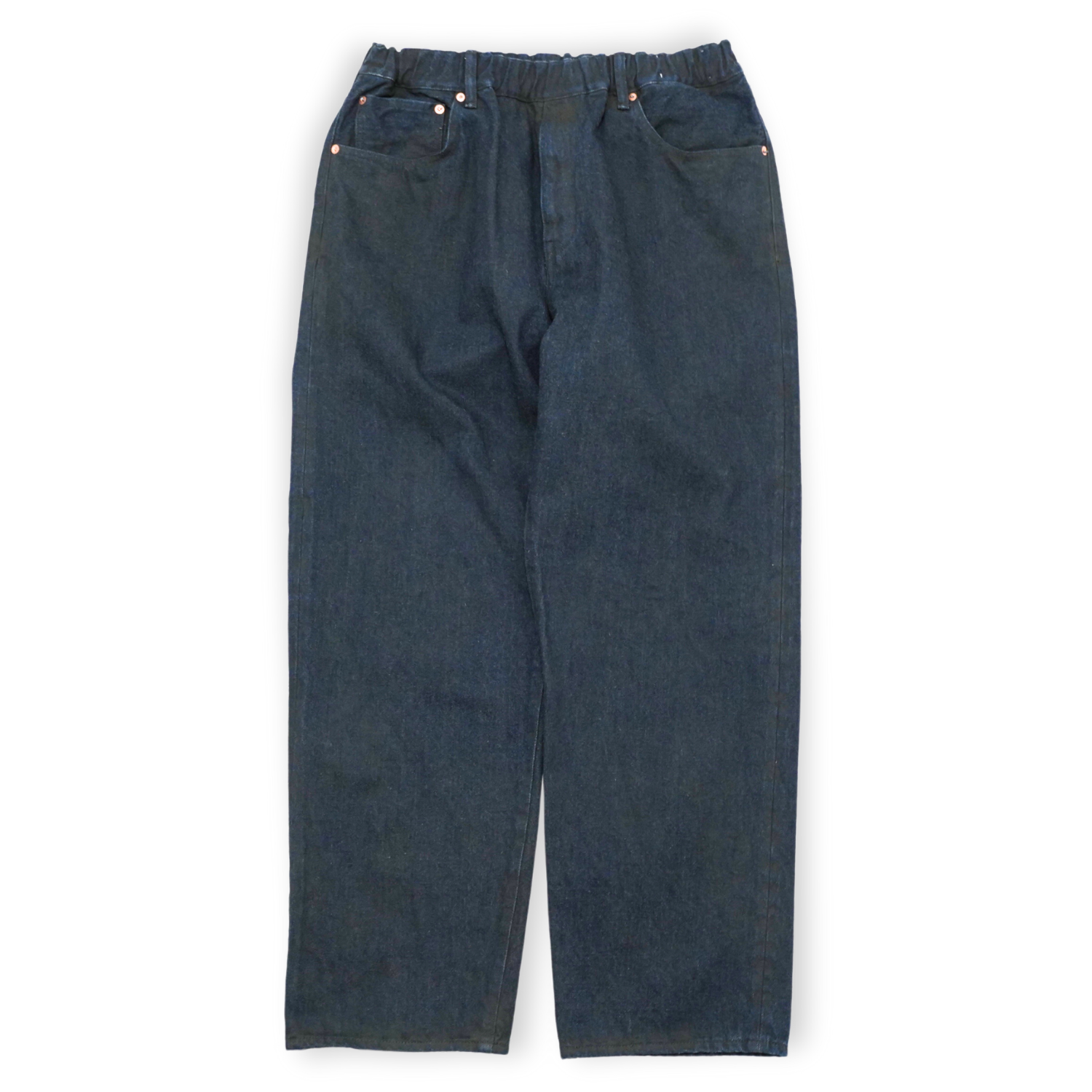 一見シンプルな 5ポケットパンツのデザインですが、ウエストにゴムを入れたイージーパンツ仕様。