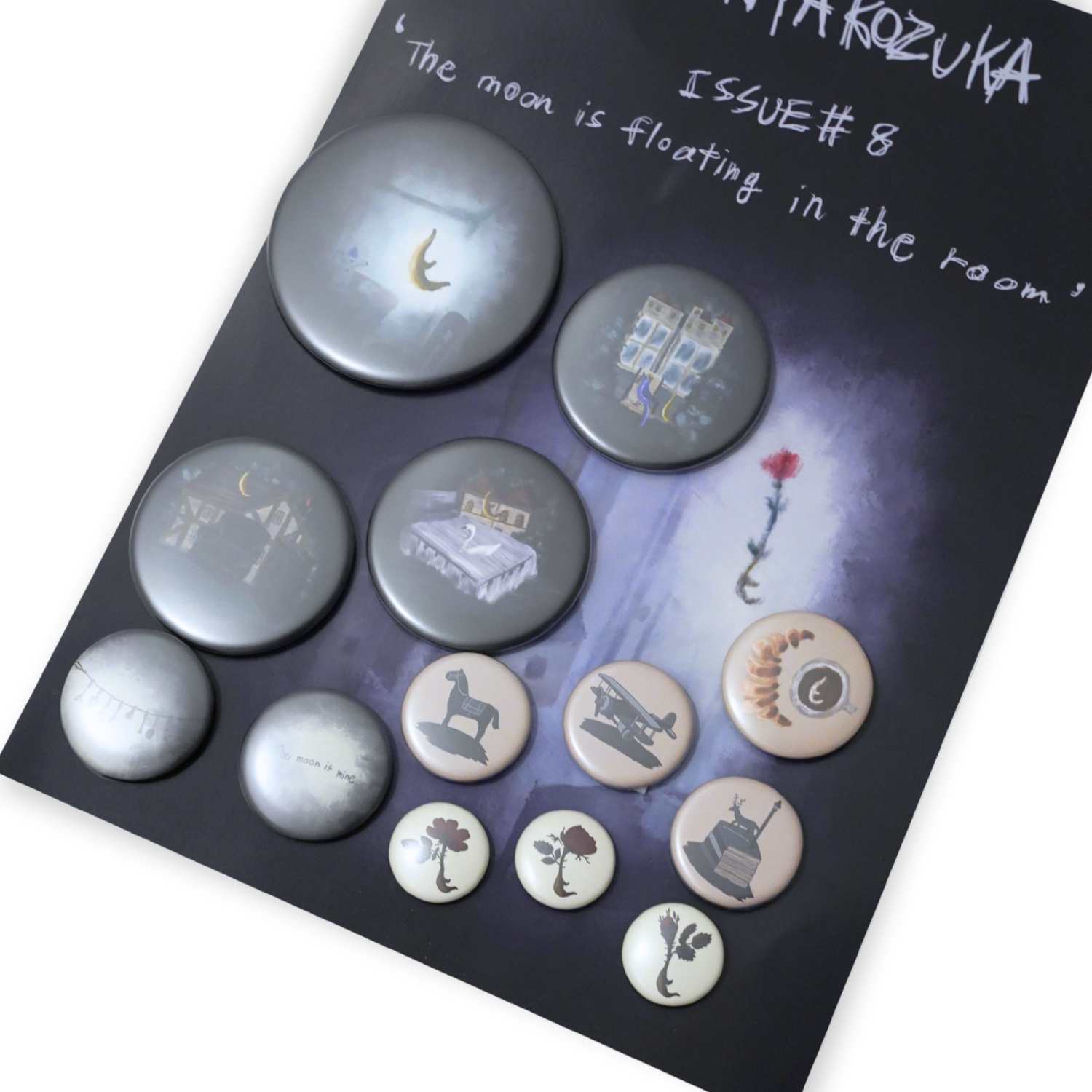 デザイナーが今期のテーマを表すモチーフをハンドドローイングで描き、それをプリントした缶バッジ。